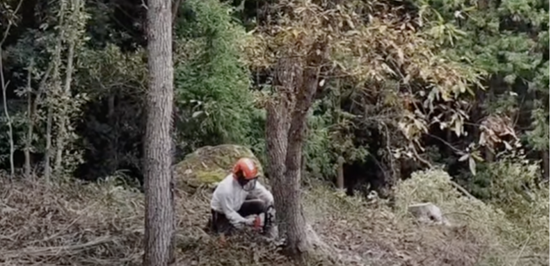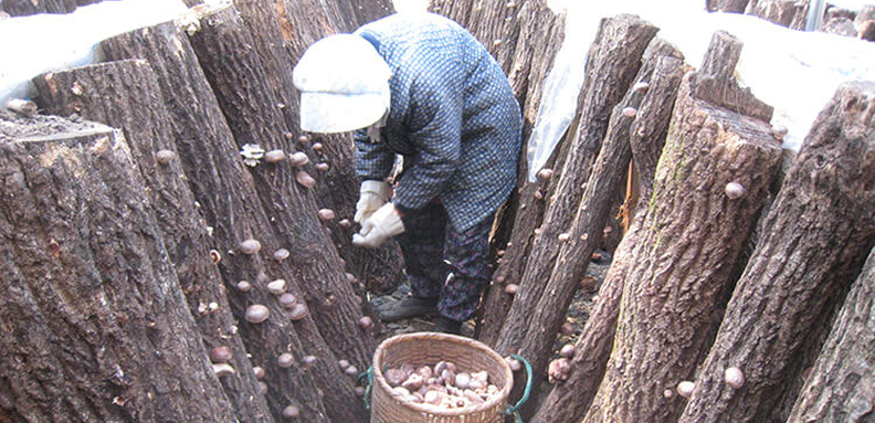 In order to ensure good ventilation and prevent direct sunlight, the inoculated wood logs are shaded with oak branches and leaves where shiitake mycelium can grow easily. This process is called “Fusekomi”.