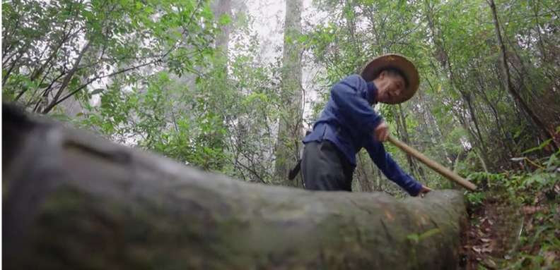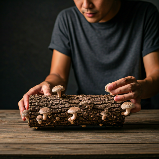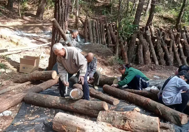 To promote growth, farmers use a homemade axe to quickly slap the wood logs. This stimulation fastens the growth of the mushroom mycelium.